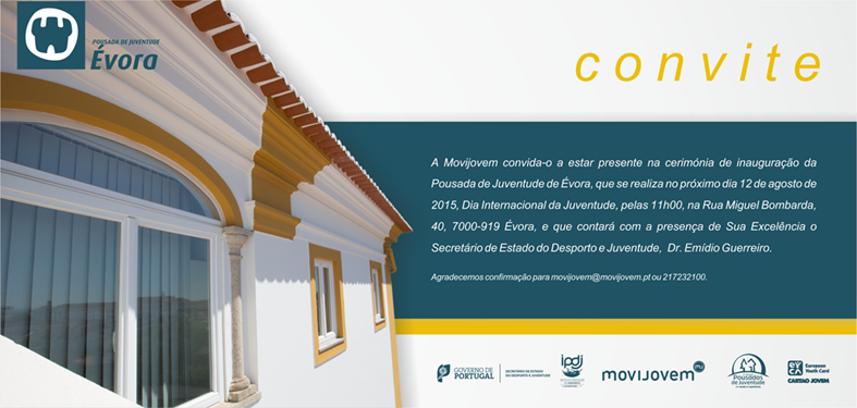 A Movijovem vai inaugurar amanhã, 12 de Agosto de 2015, Dia Internacional da Juventude, pelas 11h00, a Pousada de Juventude de Évora. A cerimónia contará com a presença do Secretário de Estado do Desporto e Juventude, Emídio Guerreiro, e do Presidente da Movijovem, Ricardo Araújo.
